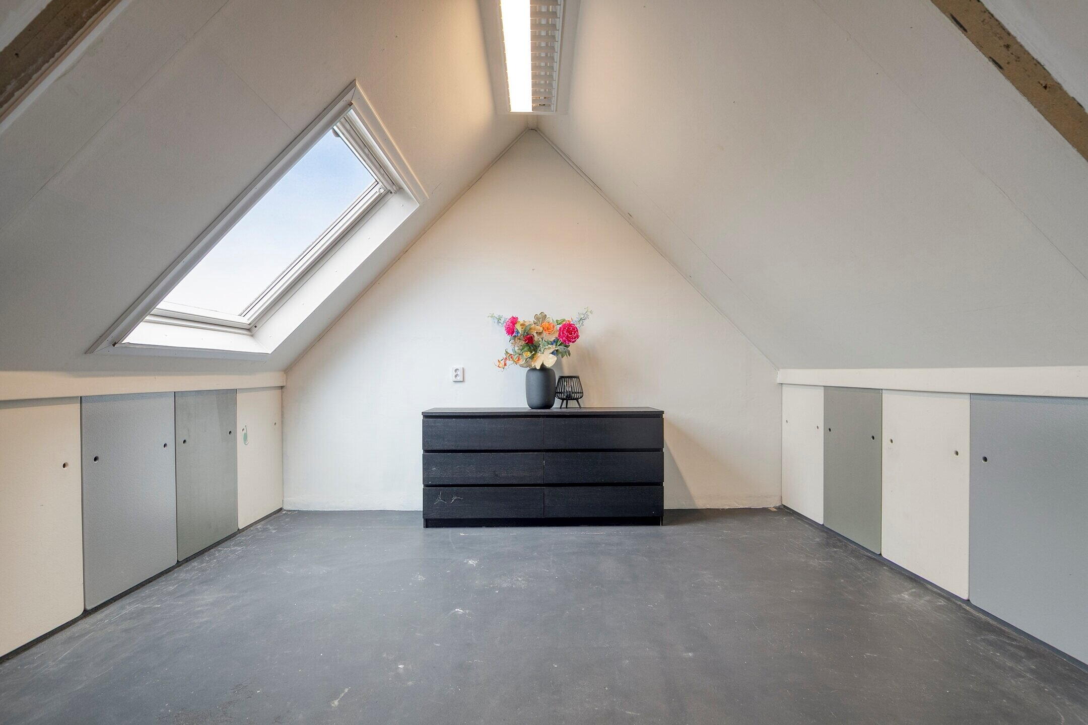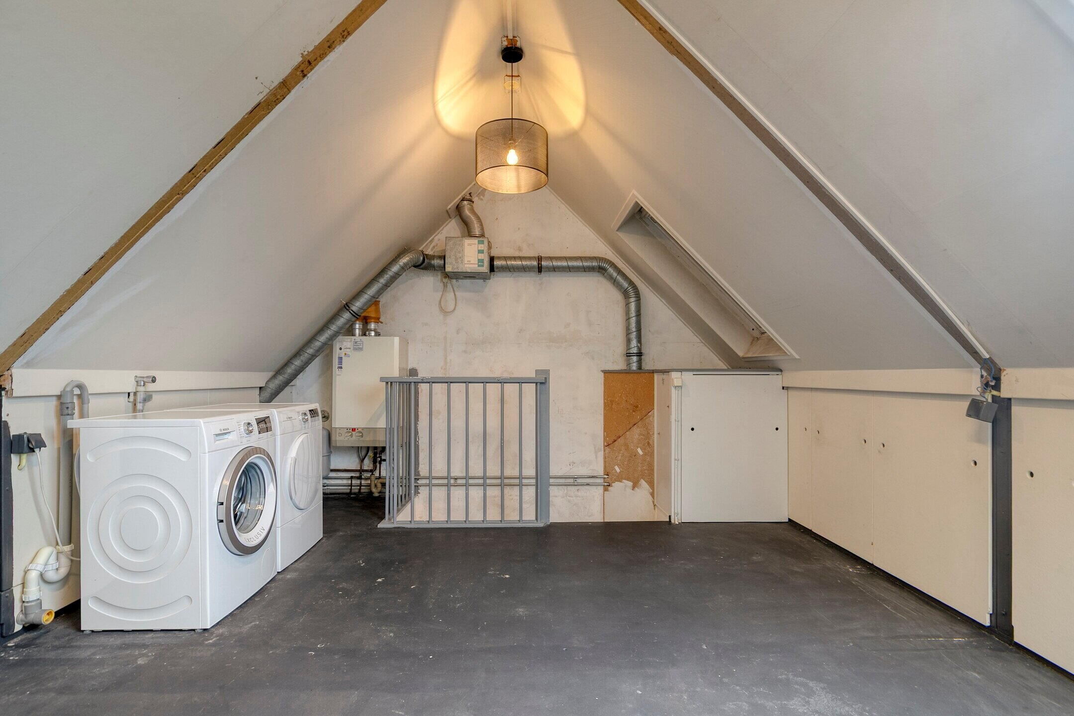 Via een vaste trap bereikt u de open zolderverdieping. Deze ruimte is voorzien van dakramen en aan beide zijden afgewerkt met houten knieschotten, wat zorgt voor volop praktische bergruimte.