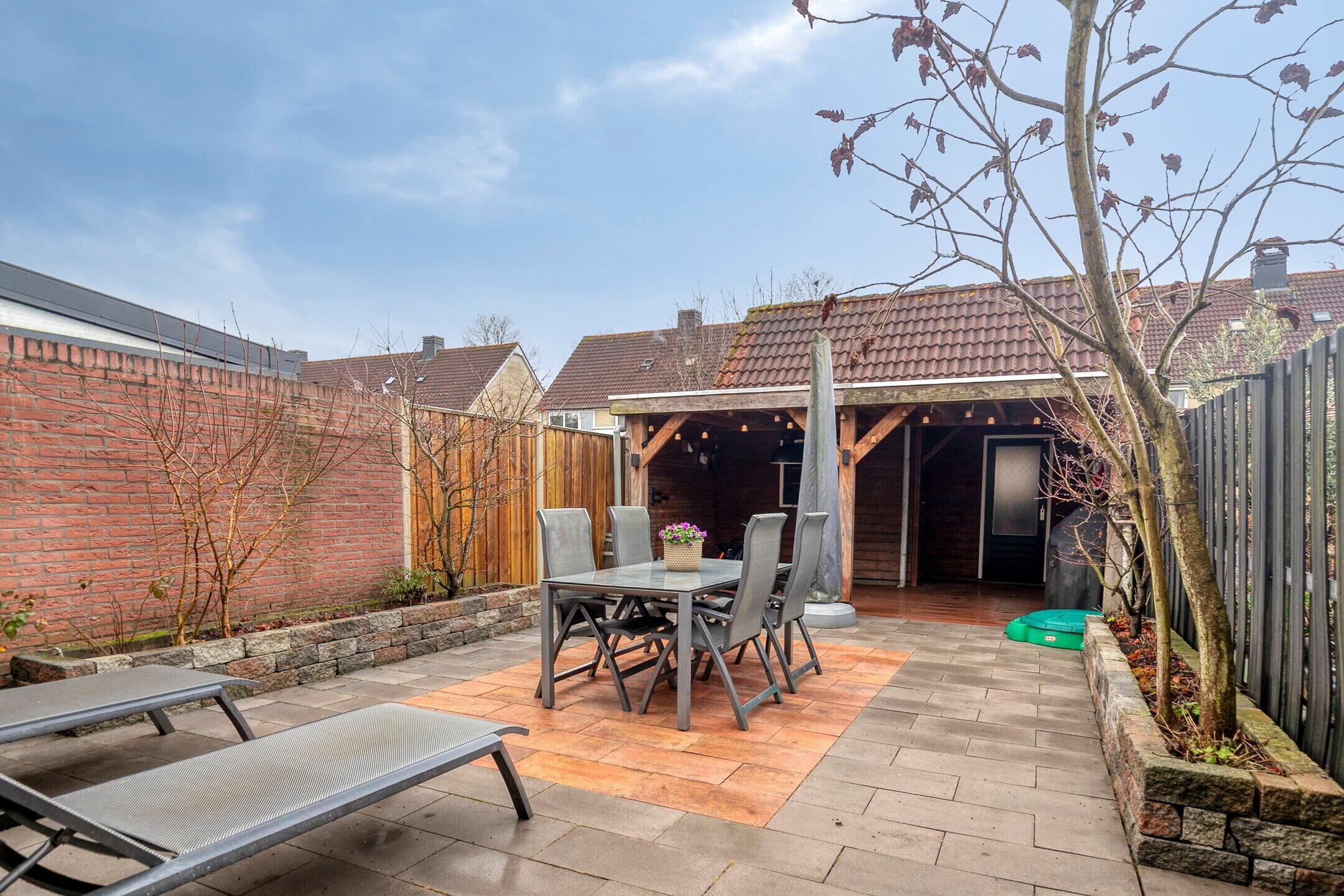 - Ruime achtertuin met overkapping en berging die voorzien is van extra geïsoleerde multifunctionele ruimte